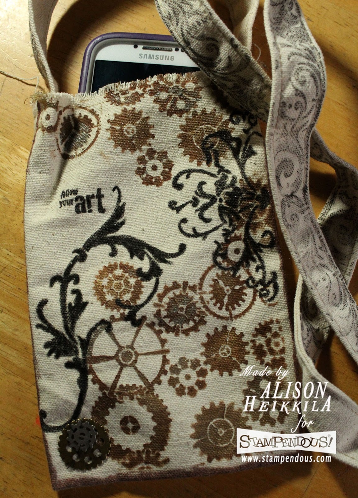 I steampunked my tote. I started ff with the Gears stencil taped to my tote. Also, I added a thick acrylic block to the inside of the tote so that the seams wouldn't be in the way, and I would have more stability.